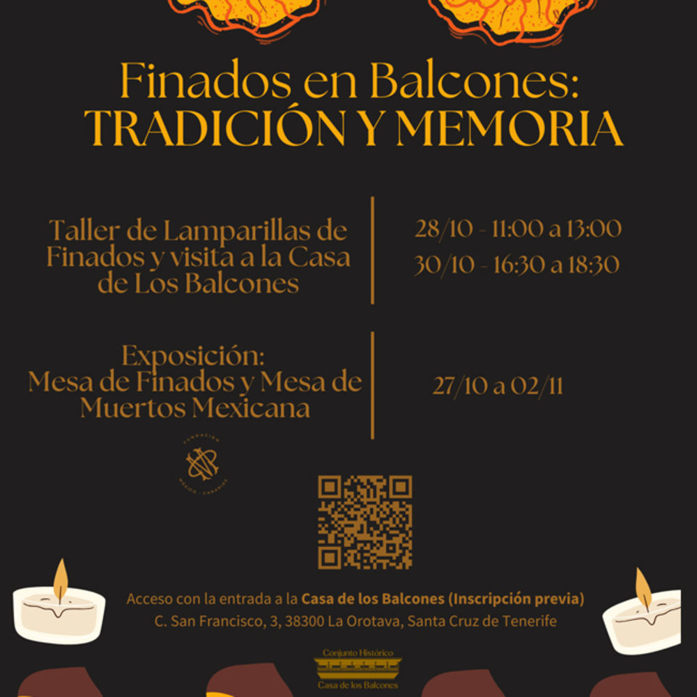 Finados en Balcones: Tradición y Memoria 2025 'Finados en Balcones: Tradición y Memoria' es una propuesta que pone en valor las tradiciones canarias de recuerdo a los difuntos, en diálogo con la cultura mexicana del Día de Muertos. Casa de los BalconesLun, 27/10/25Mar, 28/10/25Mié, 29/10/25Jue, 30/10/25Vie, 31/10/25Sáb, 01/11/25Dom, 02/11/25Programa del 27 de octubre al 2 de noviembre. 3 euros. Acceso con entrada a Casa de Los Balcones. Inscripción previaMás info Tags Fiestas EVENTOS DE LA MISMA CATEGORÍA La Librea de Valle de Guerra 2025 Sáb 18 Oct Sesión de Jawsploitation Jue 30 Oct Finados en Santa Cruz 2025 Vie 24 Oct, Sáb 25 Oct, Vie 07 Nov, Sáb 08 Nov Noticias relacionadas contemporánea Oct 14, 2025 by lagendario 'A las almas' en Tenerife y Gran Canaria filigrana conciertos 2025 El ensamble de músicas tradicionales Filigrana desarrollará una programación especial de recitales durante los meses de octubre y noviembre concebida como un homenaje a la memoria y al legado de los ancestros a través de su propuesta musical, literaria e historicista.'A las almas' propone un... Leer más contemporánea Oct 07, 2025 by lagendario Pedro Guerra y Shaila Dúrcal protagonistas de las Fiestas Patronales de Adeje tenerife octubre 2025 Adeje se prepara para vivir con intensidad sus Fiestas Patronales, en honor a la Virgen de La Encarnación, Santa Úrsula y San Sebastián, con un programa que une tradición, cultura, música y celebraciones populares.Entre los actos más destacados figuran la Gala Espectáculo 'Promesa de Tradición', la... Leer más contemporánea Oct 02, 2025 by lagendario Arona en Tradiciones 2025 tenerife octubre 2025 El tiempo parece detenerse en el casco histórico de Arona cada vez que llega una nueva edición de 'Arona en Tradiciones'. Las calles, plazas y rincones del conjunto histórico se transforman este sábado, 4 de octubre, en un auténtico viaje a la vida cotidiana de los años 40 y 50, donde los oficios... Leer más Últimas noticias' animación 15 de Octubre by lagendario 'Mariposas Negras' en el ciclo Día del Cine Español tenerife gran canaria 2025 Filmoteca Canaria proyecta 'Mariposas negras', la premiada cinta de David Baute, ganadora del Goya... Leer más góspel 15 de Octubre by lagendario Canarias Gospel Summit programa cuatro días de talleres y conciertos en Candelaria octubre 2025 tenerife El municipio sureño de Candelaria se prepara para acoger la VI edición de Canarias Gospel Summit, organizado por... Leer más cortometraje 15 de Octubre by lagendario Cayetana Guillén Cuervo, madrina de La Tijera - Festival de Cortos La Orotava 2025 La actriz madrileña Cayetana Guillén Cuervo será la madrina de la XX edición de La Tijera - Festival de Cortos La Orotava... Leer más