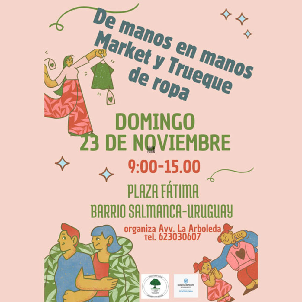 Mercadillo 'De manos en manos' 'De manos en manos, market y trueque de ropa' es un mercadillo organizado por la Asociación de Vecinos La Arboleda que tendrá lugar este domingo en Santa Cruz de Tenerife Municipio de Santa CruzDom, 23/11/25De 09:00 a 15:00 en la Plaza de Fátima del Barrio Salamanca - UruguayMás info en el 623030607 Tags Cultura EVENTOS DE LA MISMA CATEGORÍA Especial 16ª Degusta.Me Adeje 2025 Sáb 29 Nov 'Mujeres en la música' - HER 2025 Jue 04 Dic Nerea Pérez de las Heras - HER 2025 Jue 04 Dic EVENTOS MISMO LUGAR Encendido de luces de Santa Cruz Jue 20 Nov Rutas: Árboles singulares de Santa Cruz de Tenerife Sáb 26 Abr, Jue 01 Mayo, Vie 02 Mayo, Sáb 03 Mayo, Dom 04 Mayo, Sáb 24 Mayo, Sáb 07 Jun, Sáb 28 Jun, Sáb 26 Jul, Sáb 30 Ago, Sáb 27 Sep, Sáb 25 Oct, Sáb 22 Nov, Sáb 20 Dic Noticias relacionadas contemporánea Nov 20, 2025 by lagendario Islas de Libertad este sábado en La Laguna noviembre tenerife 2025 La ciudad de San Cristóbal de La Laguna acoge el sábado 22 de noviembre Islas de Libertad, un evento cultural abierto al público que forma parte del programa estatal ‘España en Libertad’ con una amplia muestra de talentos artísticos del panorama actual de Canarias. El programa incluye actuaciones... Leer más contemporánea Nov 20, 2025 by lagendario 24º Intercentros Melómano en Santa Cruz de Tenerife 2025 auditorio noviembre La Sala de Cámara del Auditorio de Tenerife acoge este sábado 22 de noviembre a partir de las 16:00 la fase autonómica del 24º Intercentros Melómano. Este certamen regional para estudiantes de música elegirá al representante de Canarias para optar al Premio de Interpretación para Solistas en... Leer más contemporánea Nov 20, 2025 by lagendario Espacios de creación y diálogo en HER 2025 con talleres y charlas con perspectiva feminista HER Festival 2025, que tendrá lugar del 2 al 6 de diciembre en Tenerife, convierte los talleres y charlas en un espacio vivo de aprendizaje, experimentación y reflexión sobre arte, género y comunidad. Durante cinco días, TEA Tenerife Espacio de las Artes, Phenomenal Estudio y el Espacio Cultural El... Leer más Últimas noticias' Cultura 20 de Noviembre by lagendario Islas de Libertad este sábado en La Laguna noviembre tenerife 2025 La ciudad de San Cristóbal de La Laguna acoge el sábado 22 de noviembre Islas de Libertad, un evento cultural... Leer más documental 20 de Noviembre by lagendario 'Historias del buen valle' en el Festival Internacional de Cine de Realidad de Canarias 2025 tenerife noviembre El Festival Internacional de Cine de Realidad de Canarias, Miradas... Leer más clásica 20 de Noviembre by lagendario El Otoño Cultural ofrece un recital de piano de Gabriel Ducatenzeiler tenerife 2025 La Fundación CajaCanarias celebra mañana, viernes 21 de noviembre, el concierto de galardonados de su Premio de Música... Leer más