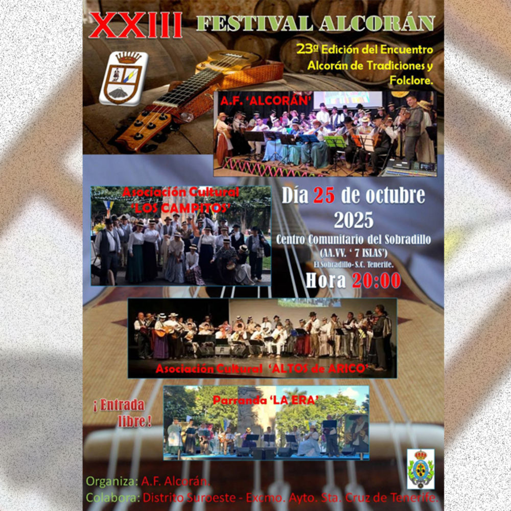 XXIII Festival Folclórico Alcorán de Tradiciones y Cultura XXIII Festival Folclórico Alcorán de Tradiciones y Cultura, organizado por la Agrupación Folclórica Alcorán con la colaboración del Distrito Suroeste y el Ayuntamiento de Santa Cruz de Tenerife. Municipio de Santa CruzSáb, 25/10/2520:00. Centro Comunitario El Sobradillo 'AAVV 7 islas'. Entrada libre Tags folclore InfoEsta vigésimo tercera edición reunirá en El Sobradillo a la Asociación Cultural Los Campitos, Asociación Cultural Altos de Arico, y la Parranda La Era, además de la actuación de la agrupación anfitriona A.F. Alcorán. Una velada que rendirá homenaje a la música y las raíces canarias, consolidando este necesario encuentro como una cita imprescindible del calendario cultural del Distrito Suroeste de la capital chicharrera EVENTOS DE LA MISMA CATEGORÍA Vargas Blues Band - Docurock 2025 Vie 14 Nov Conchita - Otoño Cultural 2025 Vie 31 Oct Maïa Barouh - Otoño Cultural 2025 Vie 28 Nov EVENTOS MISMO LUGAR Rutas: Árboles singulares de Santa Cruz de Tenerife Sáb 26 Abr, Jue 01 Mayo, Vie 02 Mayo, Sáb 03 Mayo, Dom 04 Mayo, Sáb 24 Mayo, Sáb 07 Jun, Sáb 28 Jun, Sáb 26 Jul, Sáb 30 Ago, Sáb 27 Sep, Sáb 25 Oct, Sáb 22 Nov, Sáb 20 Dic Taller 'Acuarela y Vino' Dom 09 Nov Noticias relacionadas contemporánea Oct 02, 2025 by lagendario La 'Tarde de las Tradiciones' este sábado en La Laguna tenerife octubre 2025 El Ayuntamiento de La Laguna organiza este sábado, 4 de octubre, la Tarde de las Tradiciones, un espectáculo musical protagonizado por los grupos Parranderos y Punto y la Asociación Folclórica San Borondón, que proponen un viaje musical entre Canarias y América como celebración del 25 aniversario... Leer más contemporánea Sep 15, 2025 by lagendario 'Un camino de promesas' en el XX Aniversario de la Ruta Nocturna al antiguo Ere del Hermano Pedro tenerife 2025 El antiguo Ere del Hermano Pedro volvió a convertirse en un gran anfiteatro al aire libre para ofrecer un espectáculo único en el que se aunó fotografía, teatro, y música. La XX edición de esta caminata organizada por la concejalía de Cultura del Ayuntamiento de Granadilla de Abona cuyo responsable... Leer más contemporánea Ago 25, 2025 by lagendario La Bahía de El Médano celebró los 30 años de la Muestra Folclórica de los Pueblos tenerife 2025 La bahía de El Médano acogió este fin de semana una edición más de la Muestra Folclórica de los Pueblos, con un éxito total de público y participación, y que además cumplía tres décadas con el compromiso de haberse convertido en una seña de identidad de la programación cultural estival de Sansofé.... Leer más Últimas noticias' ciencia 23 de Octubre by lagendario Premios 2025 de la Feria de la Ciencia de La Orotava tenerife noviembre La Feria de la Ciencia de La Orotava celebrará su XXII edición el próximo 9 de noviembre en la Plaza de la Constitución... Leer más antigua y barroca 23 de Octubre by lagendario Clausura del XXIII Festival de Música Antigua de La Laguna tenerife 2025 El Festival de Música Antigua de La Laguna concluye este fin de semana su edición número 23 con las actuaciones del dúo formado... Leer más Música 23 de Octubre by lagendario Segunda jornada de Keroxen 2025 en Santa Cruz de Tenerife Este sábado 25 de octubre, el ... Leer más